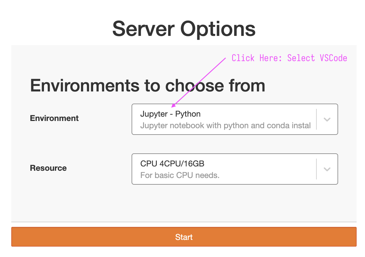 Importantly, for the environment, select Visual Studio Code. You do not need to modify the resource selector. Once you have selected VSCode, click “Start” to proceed.