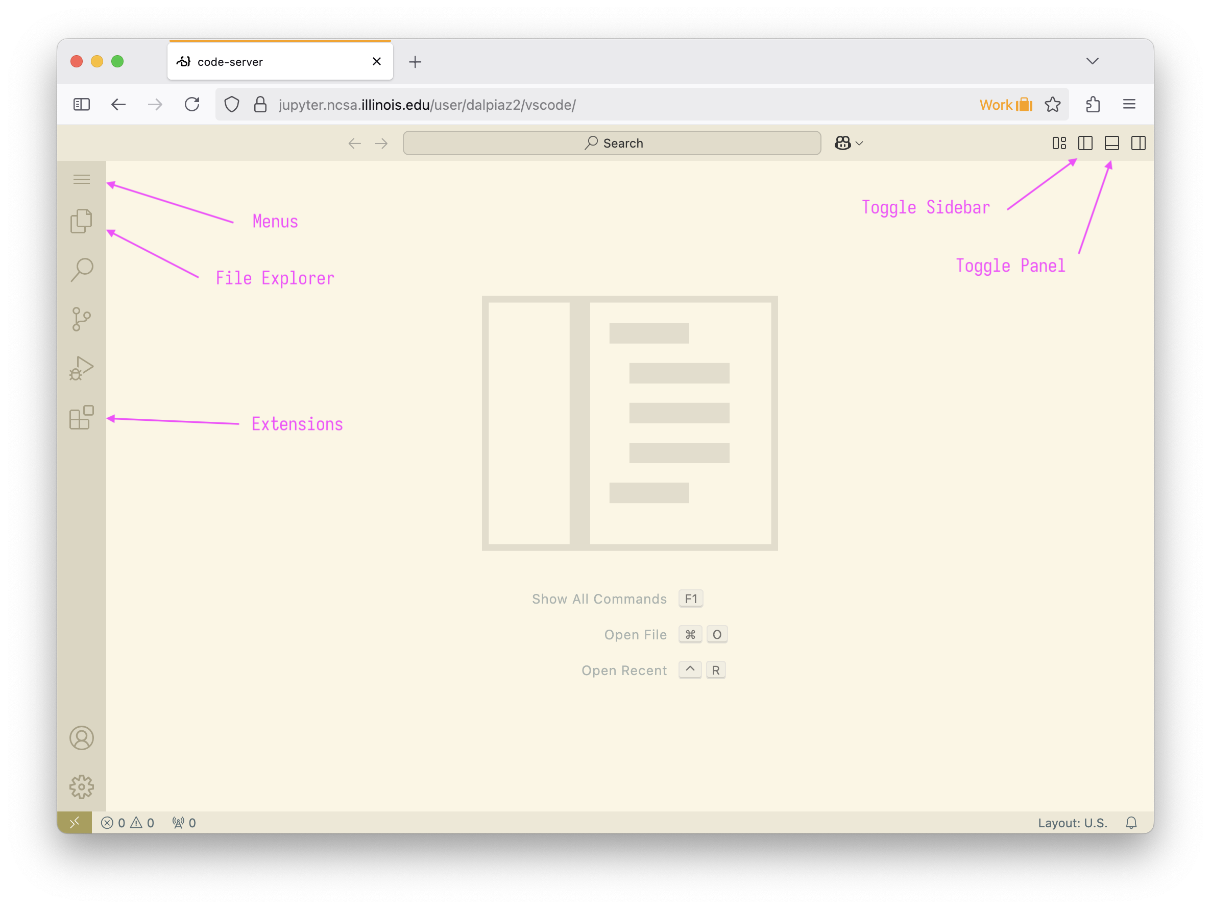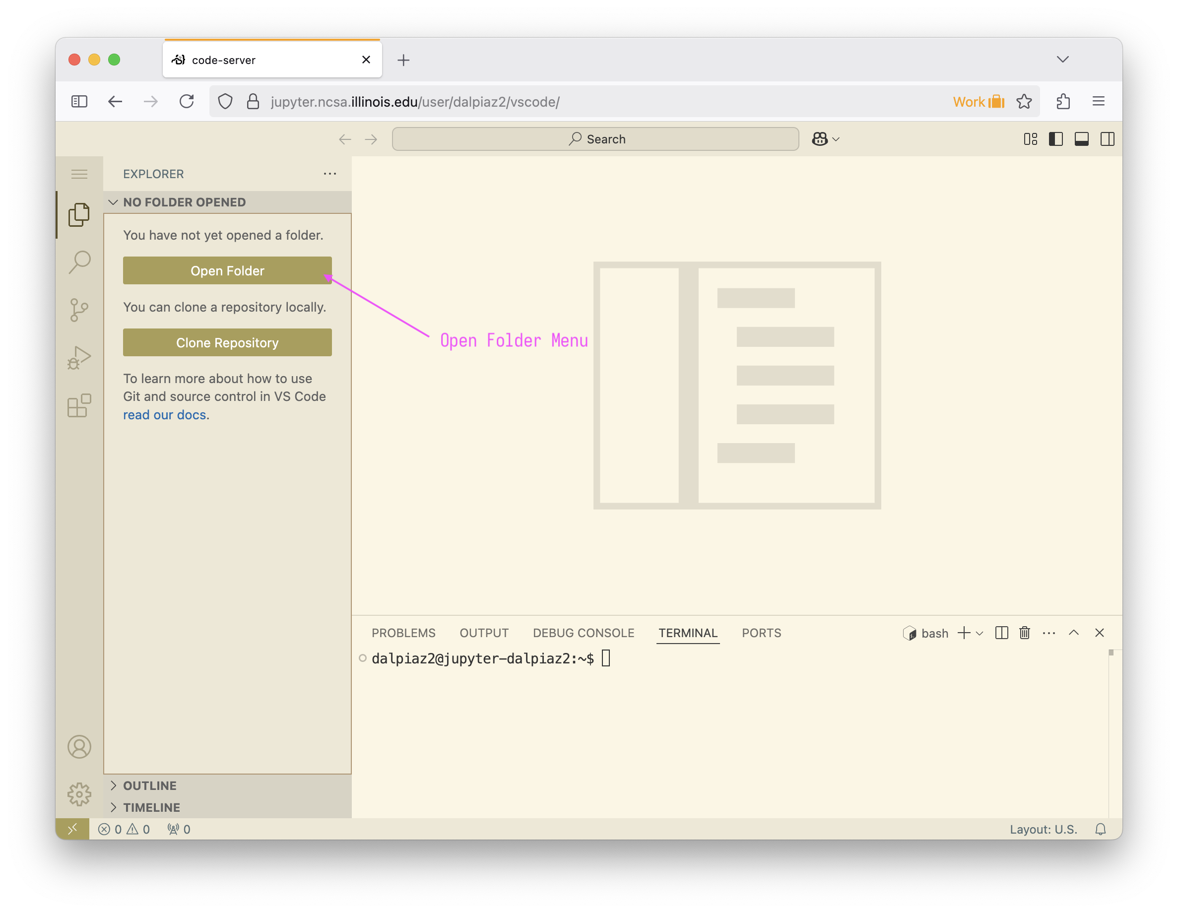 This interface allows you to run code on NCSA servers, but through the VSCode interface in a web browser. The interface is nearly identical to running VSCode locally. One notable difference is the method of accessing the usual menus, which is now a button as indicated in Figure 2.