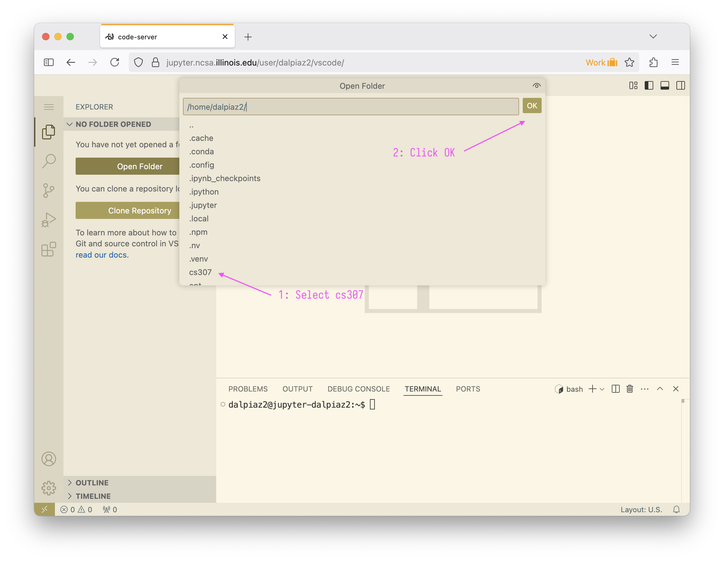 To open the cs307 folder, open the file explorer and click the “Open Folder” button as described in Figure 3